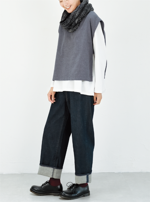 ベストはコットンフランネルを使用。短め丈のベストは、ロング T シャツと相性抜群。