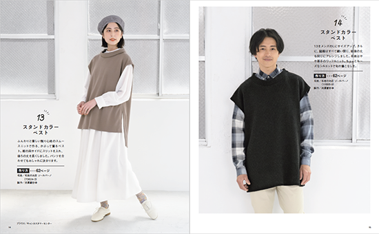ゆったりとしたウエアの本。ワンピースやブラウス、また男女兼用のアイテムも掲載。レディス9号から、ふくよかな方や、メンズも着られる大きなサイズまで展開。全33点。