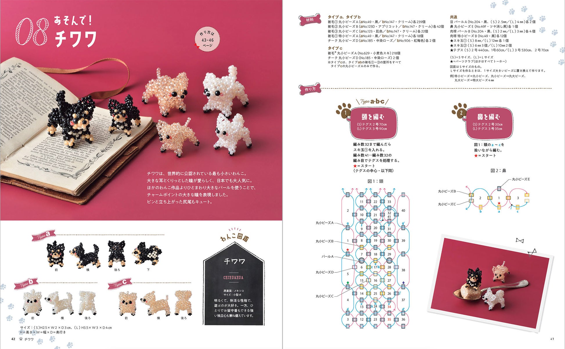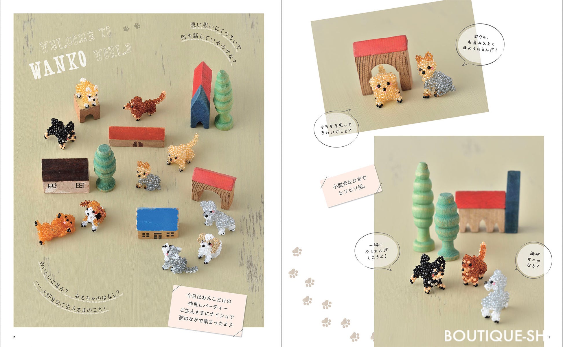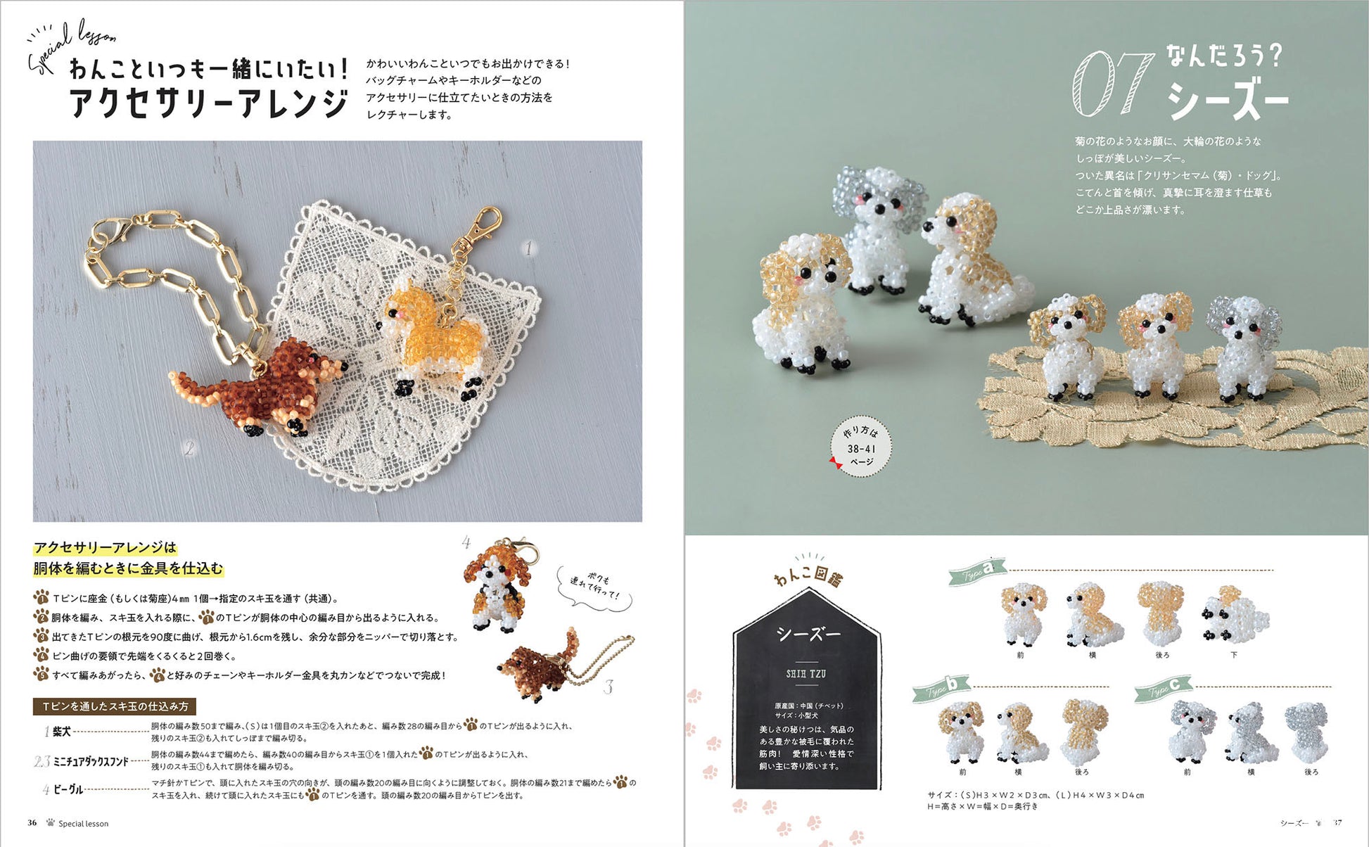 いろいろな犬種の愛らしいポーズをビーズで本物そっくりに再現。柴犬、トイプードル、ダックス、チワワ、ヨークシャテリアなど掲載。