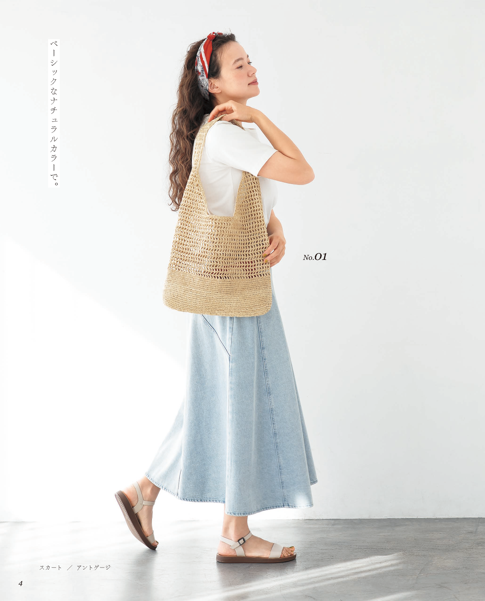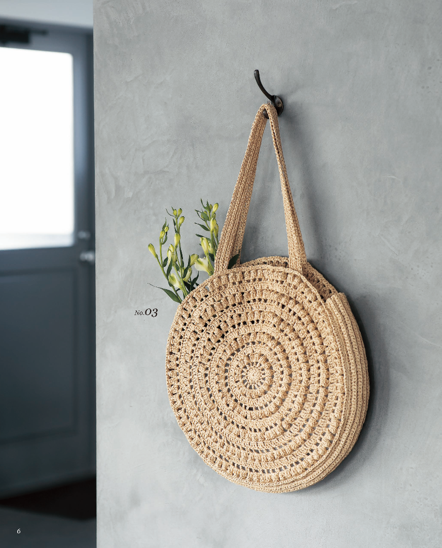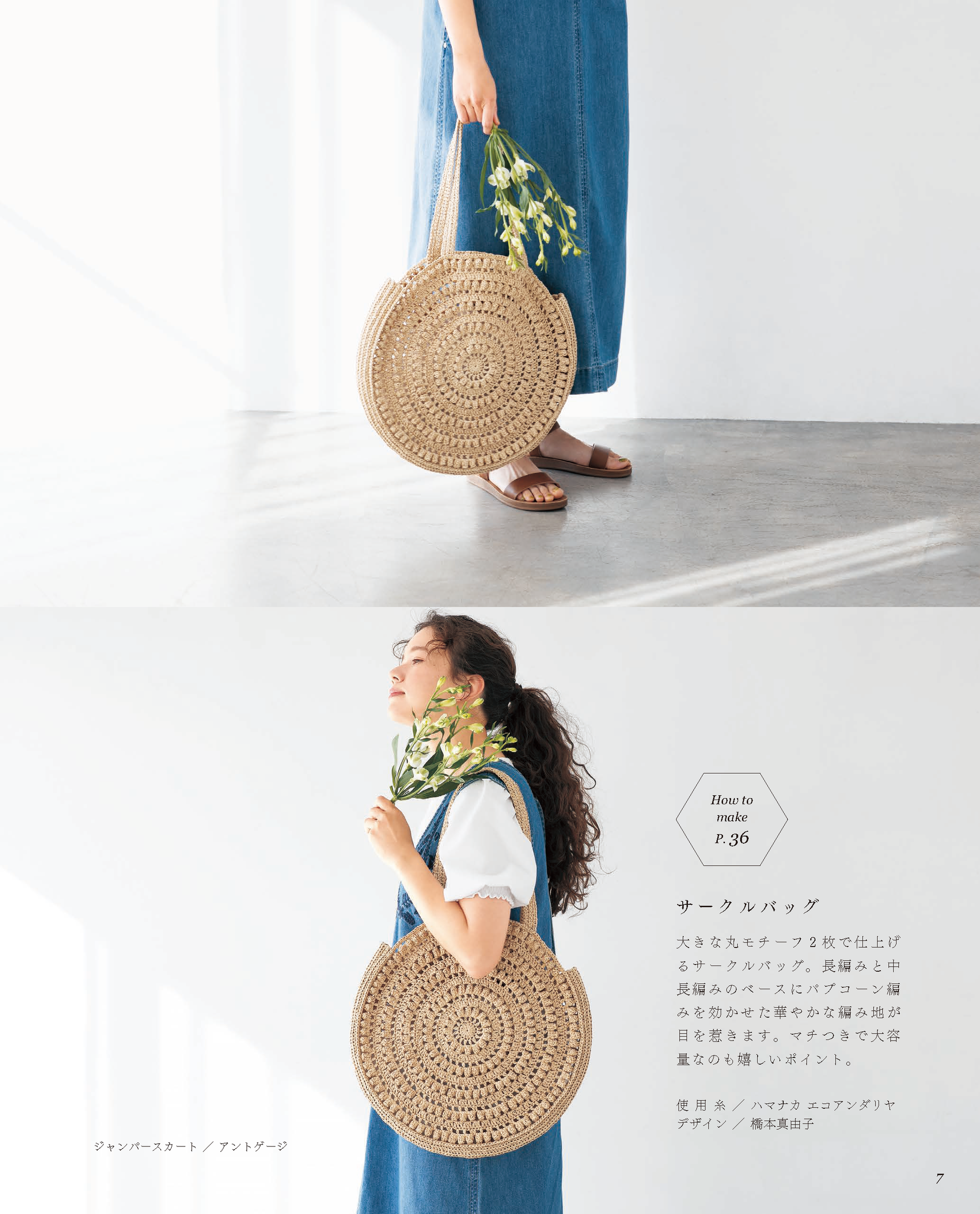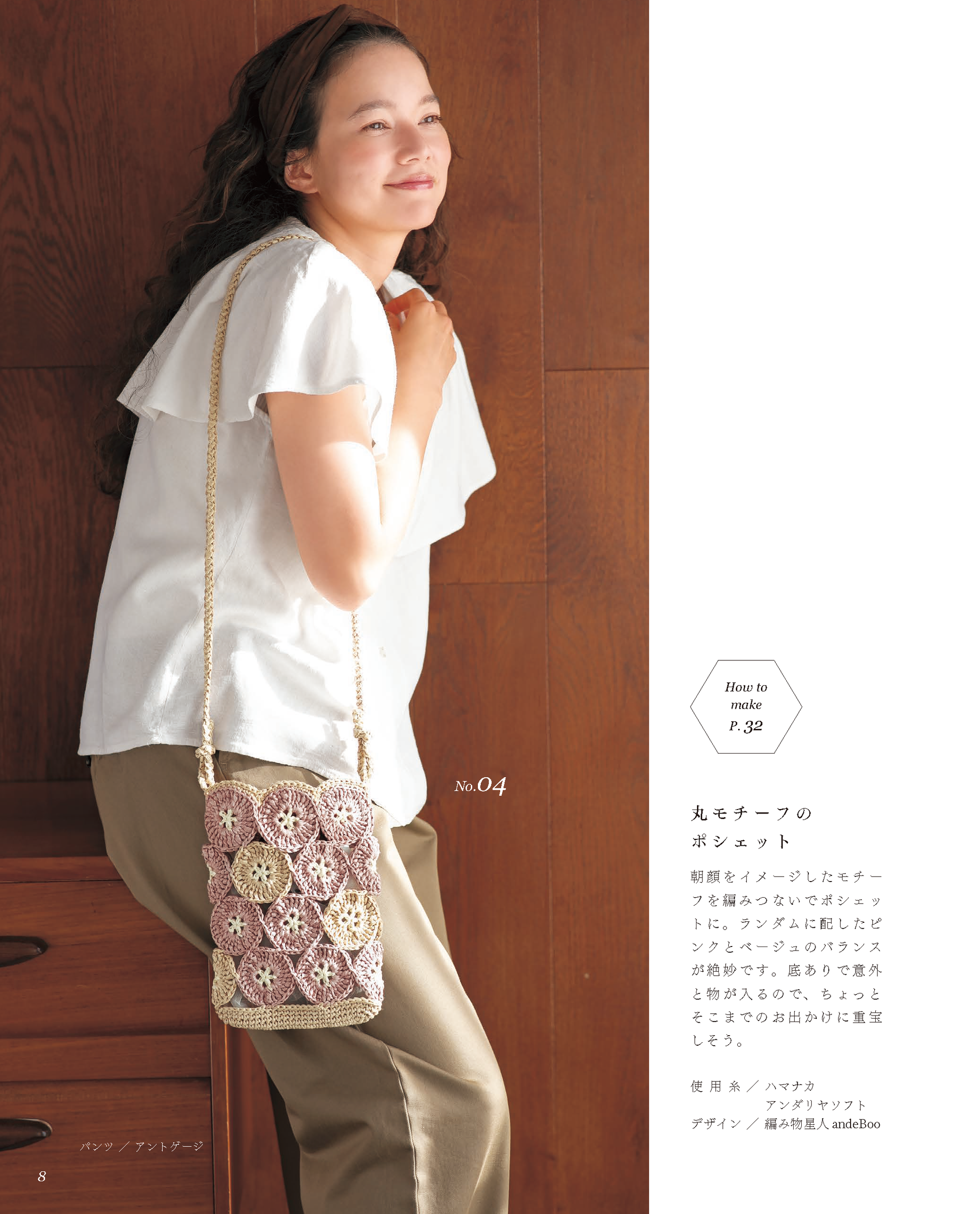 エコアンダリヤやカポックコットンなど、環境にやさしい天然繊維の糸で編むバッグとこものを集めた1冊。肩掛けできるトートバッグやポシェット、エコバッグ、大容量バッグ、巾着、リップケースチャームまで、持ち歩きたくなる便利でおしゃれなデザインを全26点掲載。
