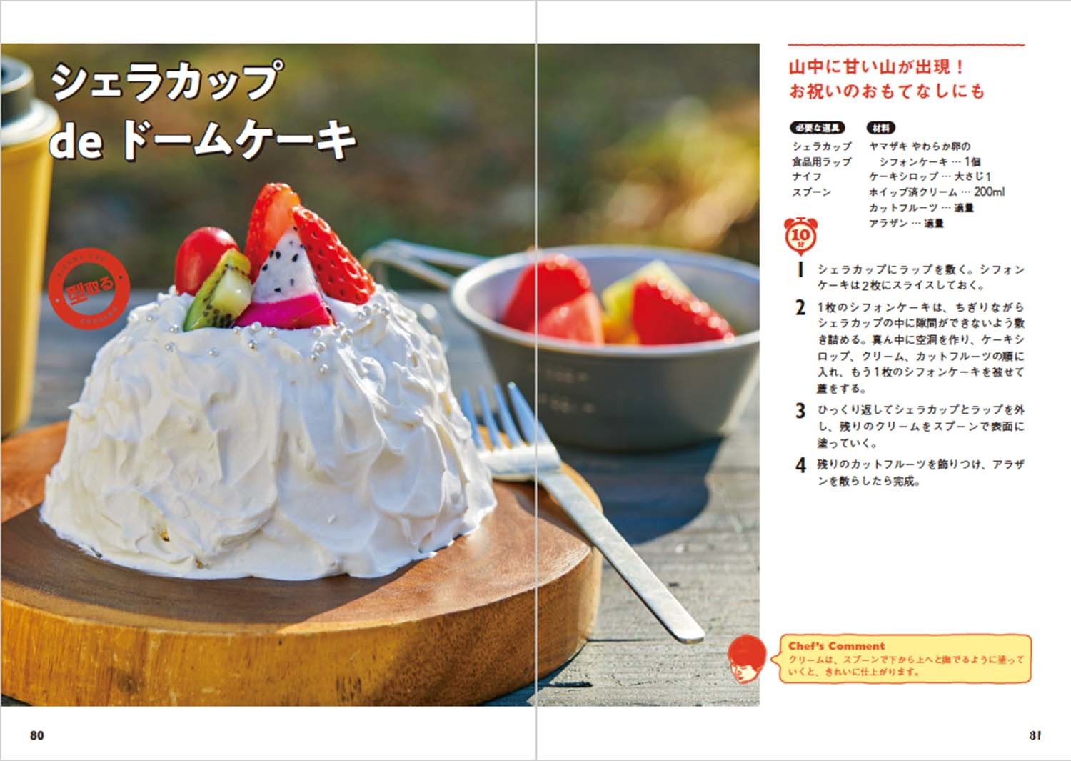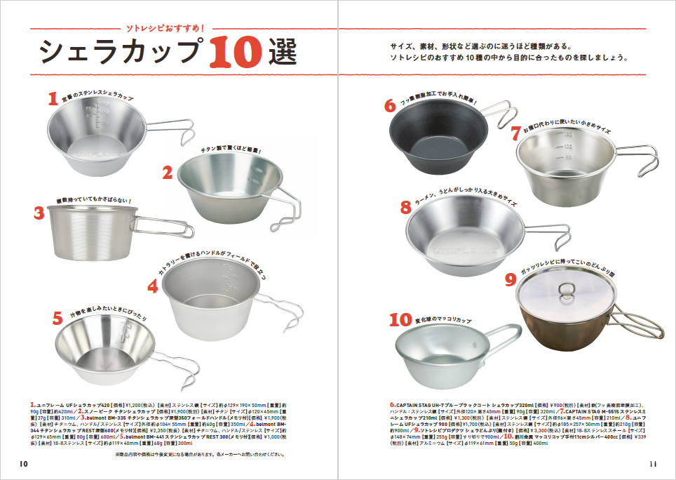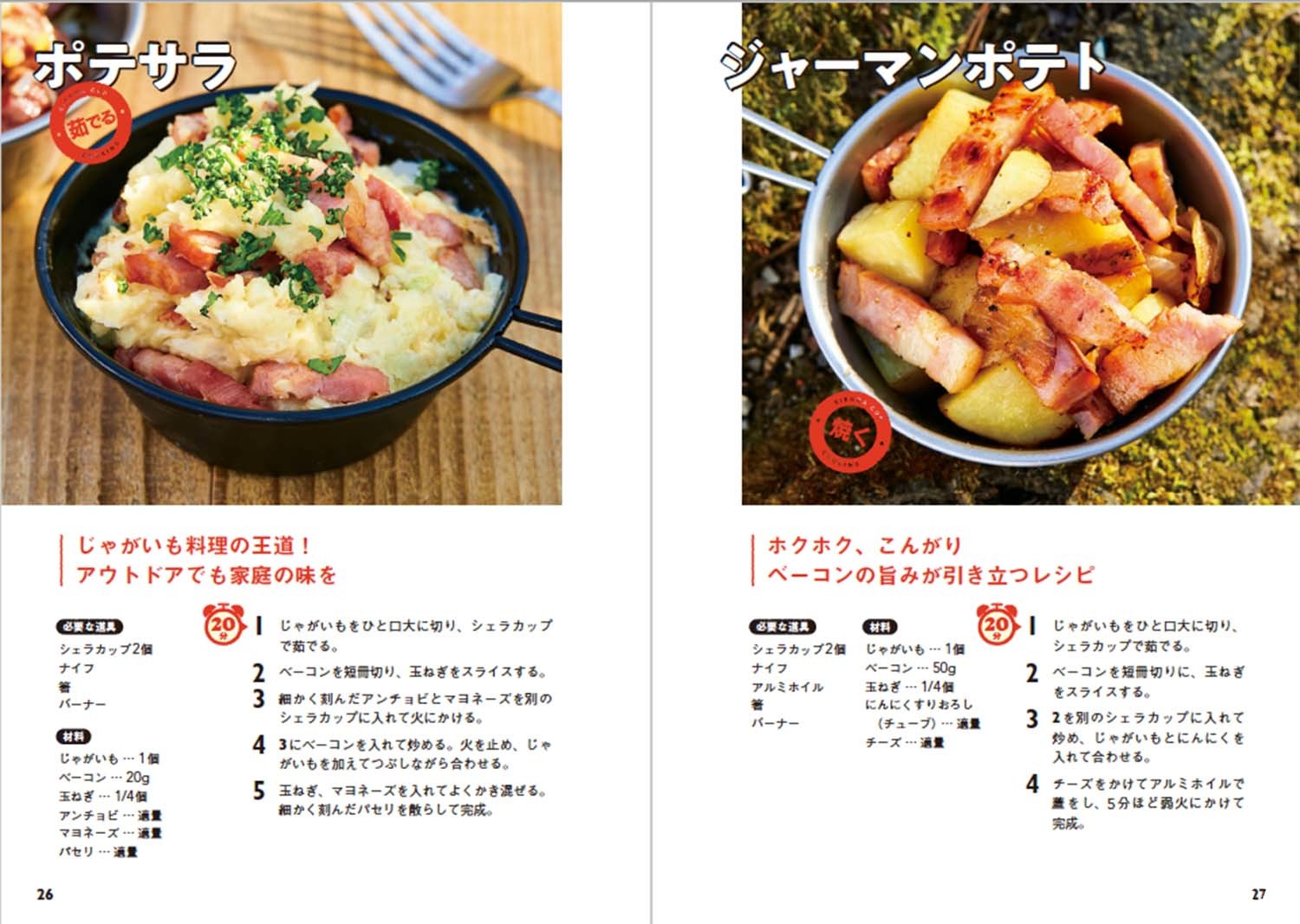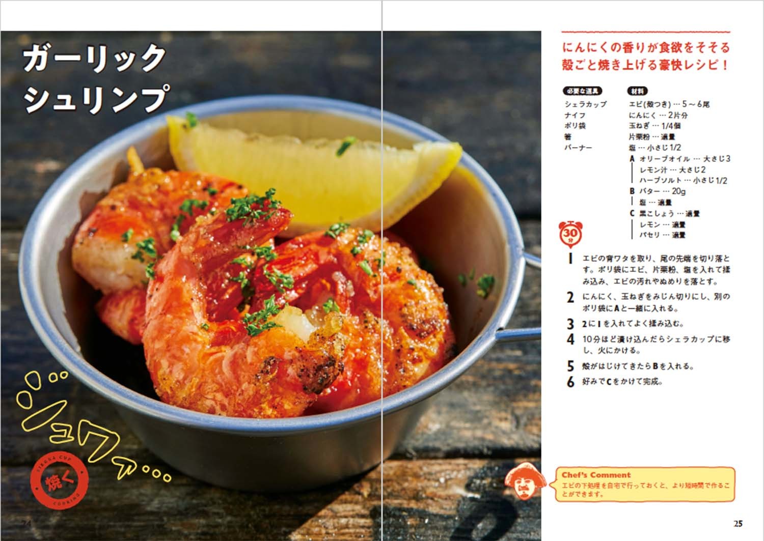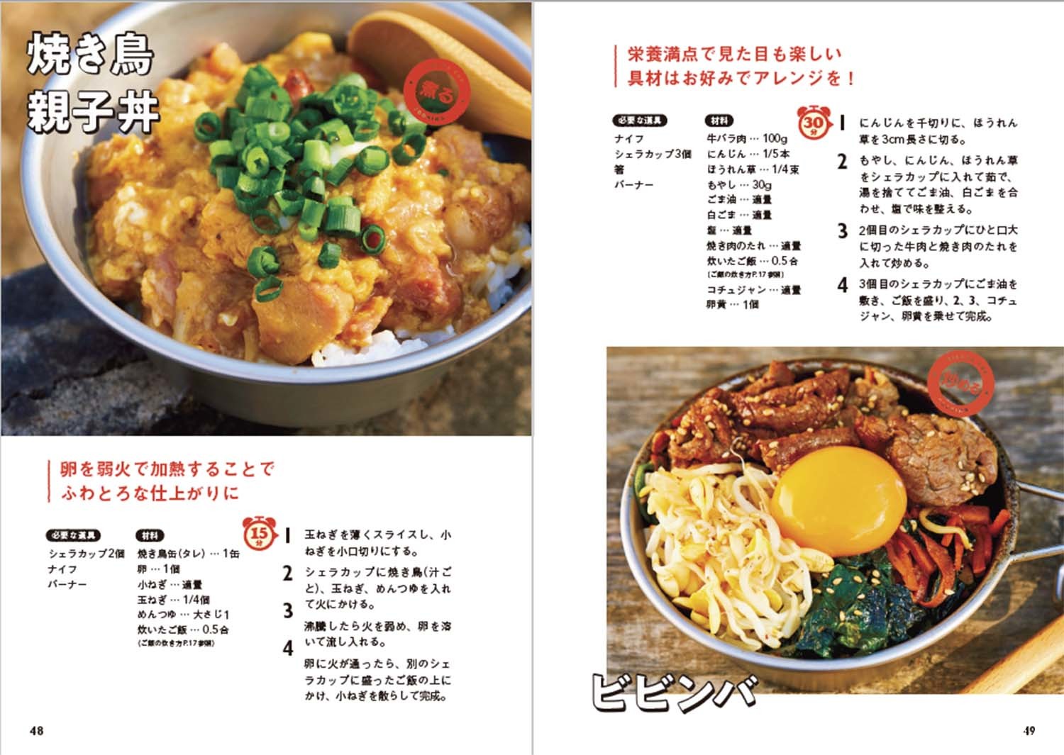 キャンプで必需品、シェラカップを使った簡単レシピ本。おつまみやしっかりした食事、デザートなどキャンプが楽しくなる料理がいっぱい。自宅でも楽しめるレシピも多数