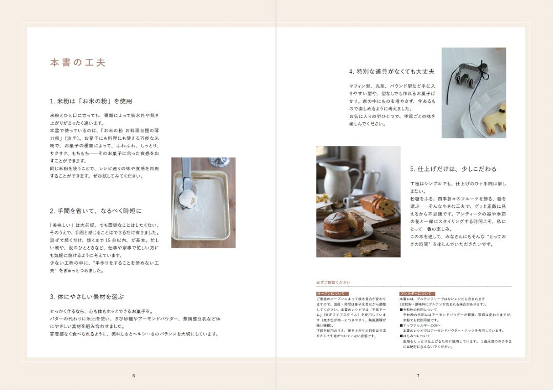 本書は米粉のマフィンやスコーンなどの基本レシピから、季節のフルーツを使ったお菓子、子どもがよろこぶ朝ごはんレシピまで幅広く掲載。忙しい日々でも米粉を続けられるように、工夫を凝らした〈混ぜて焼くだけ〉の簡単レシピを集めました。