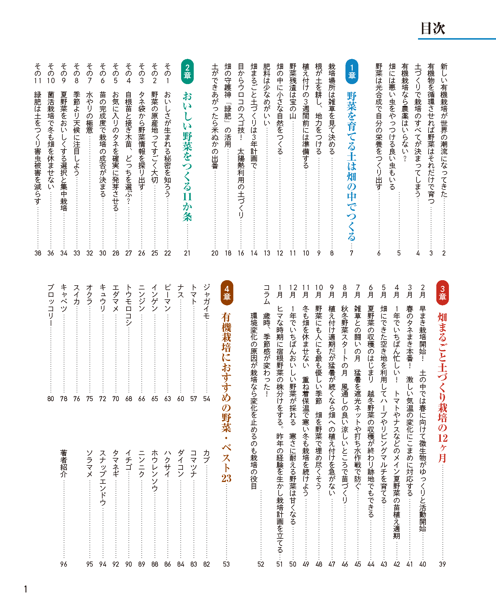 畑全体をまるごと堆肥化して、微生物のちからで野菜を育てるテクニックを中心に、有機栽培を学べる1冊。地球にも人間にも優しい有機栽培で上手に野菜を育てる方法を徹底的に解説しています。著者は無農薬栽培研究家の能登山修氏。