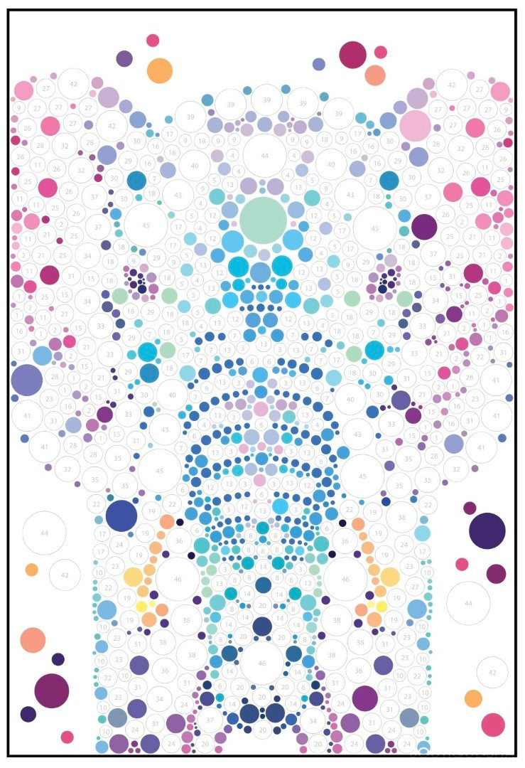本書は、様々なサイズの丸いイラストで構成されています。数字が書かれた丸には、本の後ろにあるシールシートから、同じ番号のシールを貼っていきましょう。シールシートはミシン目で切り離すことができるので、とても便利です。色つきの丸と、あなたが貼るシールが一体となって、美しい作品が生まれます。