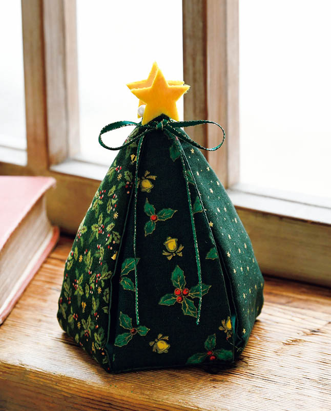 五角形の5辺それぞれに三角形のモチーフを縫い付け、三角形の頂点をリボンでまとめます。