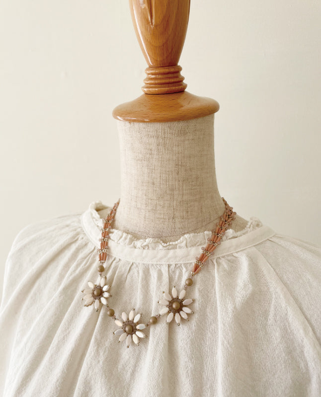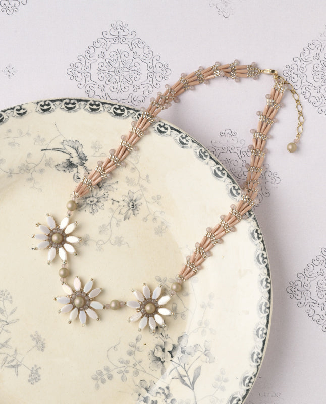 オーバル形のカットが美しいビーズを使用。裏側の工夫で広がるお花に編み上げます。くすみピンクのツイストのネックレスは肌なじみがよく、うららかな春の陽気のよう。日本未発売の新しいビーズの絶妙な組み合わせが装いに彩りをプラスします。
