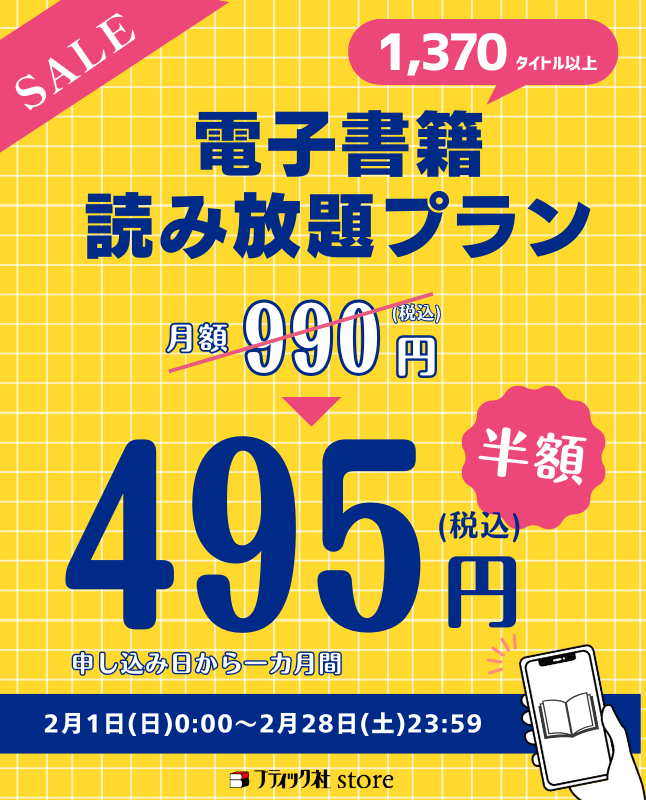 セール期間中にお申し込みいただくと、電子書籍読み放題プランをお申し込み日から1カ月間、通常月額990円(税込)のところ495円(税込)でご利用いただけます。